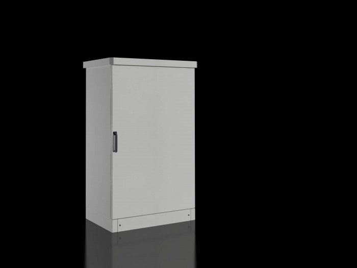 Obudowa zewnętrzna, jednościenna, aluminiowa obudowa do instalacji na zewnątrz, składająca się z podstawowej obudowy z płytą dławową w 3 częściach, dachu przeciwdeszczowego i podstawy. Obudowa wykonana z aluminium o średnicy 2 mm , złożona i zespawana z jednego kawałka. Całkowicie pomalowane proszkowo na czysty poliester RAL 7035. Wysoka stabilność dzięki dziesięciokrotnemu profilowaniu korpusu obudowy. Siatka perforat obwodowego z przodu i głębokością szafy do instalacji akcesoriów systemowych. Szafa jednodrzwiowa, drzwi z piankowym uszczelnieniem PO, wkręcana kwadratowa rama rurowa z perforacją w siatce wymiarowej, 3-punktowa ryglowa uchwyt obrotowy i półcylindrowa rura o profilu zgodnie z normą DIN 18252. Drzwi z wewnętrznymi, zawieszonymi zawiasami 130° i ogranicznikiem drzwi 110°. 100 mm wysoki podstawek wykonany z aluminium o średnicy 3 mm, z przykręconymi panelami cokołowymi. Dach ochronny przed warunkami atmosferycznymi, 55 mm wysokości, z wystającą formacją ze wszystkich stron, 25 mm, zatkany i przykręcony. Śruby oczkowe przyspawane do wewnętrznego dachu, przykryte ochroną przeciwpogodową RO do transportu dźwigiem w pełni wyposażonej jednostki. Indywidualne montaże wnętrza z płytami montażowymi, częściowymi szynami i systemami szyn o profilu PLA oraz metrycznym są dostępne w akcesoriach systemowych. Materiał: Obudowa, dach i podstawa: aluminium AlMg3. Powierzchnia: Obudowa, dach i podstawa ochronna przed pogodami: pomalowane proszkowo w kolorze RAL 7035. Czyste poliester Wymiary: Obudowa: WHD 800 x 1200 x 500 mm – całkowita wysokość 1355 mm, wraz z podstawą i zadaszeniem przeciwdeszczowym Osłona deszczowa: WHD: 850 x 55 x 550 mm Wysokość podstawy: 100 mm Klasa ochrony: IP 55 według EN 60 529 Producent: Rittal GmbH & Co. KG Typ: Podstawowa obudowa zewnętrzna CS 9783.610