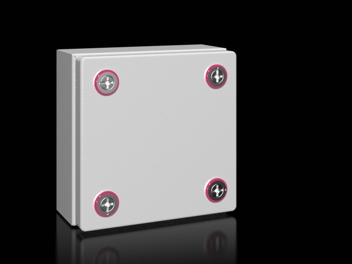 Obudowa (skrzynka zaciskowa bez płytki odlewowej) Obudowa z osłoną: Stabilna konstrukcja z blachy stalowej, nadwozie złożone z jednego kawałka i spawane, z otworem ochronnym na osłonę osłony z okiem na osłonę montażową na ścianie, osłona z piankowym uszczelnieniem U, z połączeniem przewodu PE w obudowie oraz przez uchwyt w kształcie litery U w pokrywie, dla szybkiego i łatwego uziemienia, Z zamkiem Mini Cam. Kod QR: Kod QR wydrukowany na korpusie, okładce i tabliczce z oceną dla wyraźnej identyfikacji i łatwego dostępu do odpowiednich informacji i dokumentacji o produkcie oraz dla wyraźnej wykrywalności poszczególnych części. Akcesoria: zawias pokrywy, uchwyt na osłonę, płytka montażowa, szyna na cylinder, uchwyt montażowy na ścianie, pazur montażowy na drugi poziom. Materiał: Obudowa, pokrywa: blacha stalowa Wykończenie powierzchni: Potrójna obróbka powierzchni dla optymalnej ochrony przed korozją i odpornością na oleje mineralne, smary, emulsje obróbki i rozpuszczalniki: powłoka nanoceramiczna, elektroforetyczna warstwa gruntowa, powłoka proszkowa na zewnątrz teksturowanym RAL 7035. Kategoria ochrony według IEC 60 529: Kategoria ochrony IP 66 do UL 508A: Wymiary typu 4 (Szerokość x Wysokość x Wysokość): 150x150x80 mm
