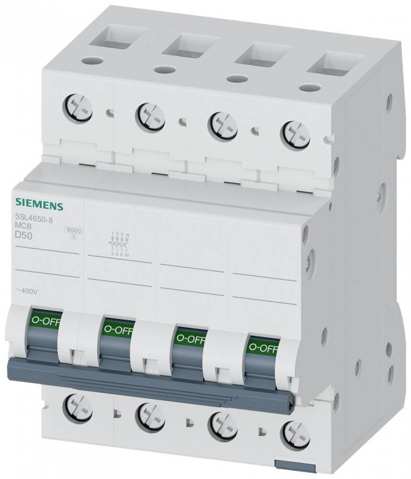 Wyłącznik nadmiarowo-prądowy 400V 10kA, 3+N-bieg., D, 50A wyłącznik nadmiarowo-prądowy 400 V 10 kA, 3+N-bieg., D, 50 A Wyłącznik nadmiarowo-prądowy SENTRON do bezpiecznej ochrony przeciwzwarciowej i przeciążeniowej w standardowych zastosowaniach w budynkach mieszkalnych i użytkowych. Montaż i demontaż urządzenia bez użycia narzędzi. Proste okablowanie zasilania przez położoną z tyłu szynę zbiorczą. Wyłączniki nadmiarowo-prądowe 5SL są dostępne w wersjach 1-, 2-, 3-, 4-, a także w wersjach 1+N- i 3+N-biegunowych oraz w innych wykonaniach specjalnych. Szeroka gama akcesoriów, np. łącznik pomocniczy, umożliwia różnorodne rozszerzenie funkcji. Po prostu bezpiecznie z urządzeniami ochronnymi SENTRON.