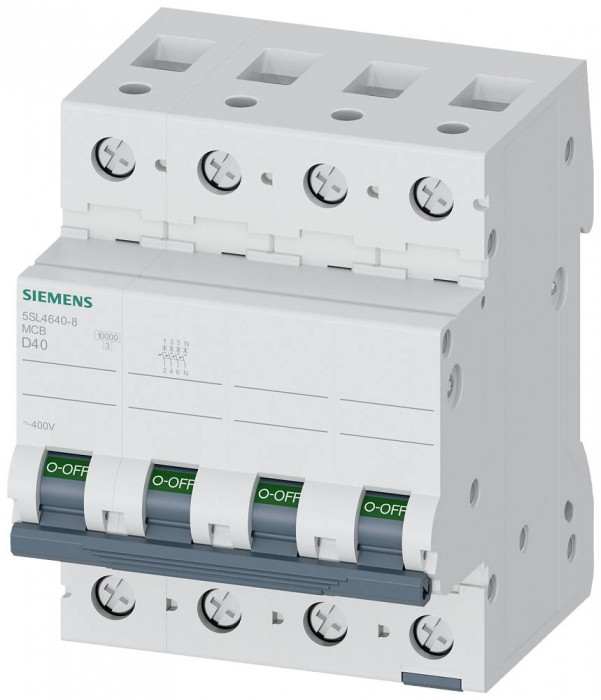 Wyłącznik nadprądowy 400V 10kA, 3+N-bieg., D, 40A wyłącznik nadmiarowo-prądowy 400 V 10 kA, 3+N-bieg., D, 40 A Wyłącznik nadmiarowo-prądowy SENTRON do bezpiecznej ochrony przeciwzwarciowej i przeciążeniowej w standardowych zastosowaniach w budynkach mieszkalnych i użytkowych. Montaż i demontaż urządzenia bez użycia narzędzi. Proste okablowanie zasilania przez położoną z tyłu szynę zbiorczą. Wyłączniki nadmiarowo-prądowe 5SL są dostępne w wersjach 1-, 2-, 3-, 4-, a także w wersjach 1+N- i 3+N-biegunowych oraz w innych wykonaniach specjalnych. Szeroka gama akcesoriów, np. łącznik pomocniczy, umożliwia różnorodne rozszerzenie funkcji. Po prostu bezpiecznie z urządzeniami ochronnymi SENTRON.