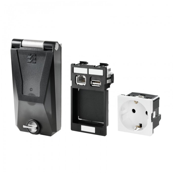 Wyposażona obudowa komponentu, IP65, w stanie zamkniętym, 2x dane, 1x zasilanie, Ekranowane, Pokrywa z tworzywa sztucznego, Gniazdo DE Obudowa komponentu w pojedynczej ramce jest zamocowana za pomocą dwóch różnych wkładek. Podstawowa, łatwa w instalacji obudowa składa się z płytki wkładki z dwoma złączami danych oraz jednym złączem zasilania. Stosuje się albo gniazdo zasilania, albo wkładkę danych usług sieciowych. Kompaktowa obudowa jest odporna na uderzenia i spełnia wymagania klasy ochronności IP 65. Obudowa komponentu może być opcjonalnie wyposażona w kłódkę i klucz.