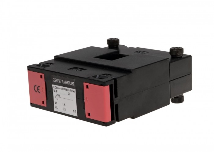Z otwieranym rdzeniem. Przekładnia 250/5. Moc 1,5 VA. Przekładnik prądowy służy do proporcjonalnej zmiany dużych natężeń prądu na niższe wartości, przystosowane do zakresów pomiarowych urządzeń kontrolnych i pomiarowych.
