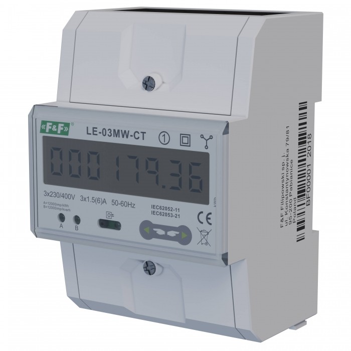Zdalny odczyt. Trójfazowy. Dwukierunkowy. Taryfowy. Port RS-485 + Modbus RTU. Do pomiaru półpośredniego. Z programowalną przekładnią. LE-03MW CT jest elektronicznym, 2-kierunkowym licznikiem energii elektrycznej prądu trójfazowego przeznaczonym do pomiaru w układzie półpośrednim. Wbudowany zegar czasu rzeczywistego umożliwia pomiar zużycia energii z podziałem na różne strefy taryfowe. Interfejsy komunikacyjne RS-485 z protokołem Modbus RTU oraz port optyczny zgodny z normą EN62056 (IEC1107) umożliwiają zdalny odczyt i konfigurację licznika. Port szeregowy RS-485 i zaimplementowany protokół komunikacyjny MODBUS RTU pozwalają stosować wskaźnik w sieciach zdalnego odczytu danych.