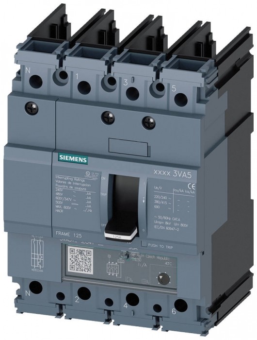 Wyłączniki, UL, Frame 125, 60 A, 4-bieg., 25 kA, TM, FTAM, bez przyłącza wyłącznik 3VA5 UL Frame 125 klasa zdolności załączania S 25kA przy 480V 4-bieg., ochrona instalacji TM230, FTAM, In=60A zabezpieczenie od przeciążeń Ir=60A nastawiony na stałe zabezpieczenie przeciwzwarciowe Ii=5...10 x In przewód neutralny bez ochrony bez przyłącza Wyłącznik kompaktowy SENTRON 3VA5 z dopuszczeniem UL dla skutecznej ochrony systemu poprzez bezpieczne odłączenie w przypadku przeciążenia i zwarcia. Wyłączniki kompaktowe 3VA5 i 3VA 6 wyznaczają nowe standardy elastyczności i modułowej różnorodności przy niewielkich rozmiarach. Oprócz standardu IEC obydwie serie spełniają także standard UL. Tym samym wszystkie funkcje mogą zostać zastosowane i wykorzystane w urządzeniach na całym świecie. Wyłączniki kompaktowe 3VA5 są dostępne w wersjach 1-, 2-, 3- i 4-biegunowych o różnych znamionowych prądach ciągłych do montażu stałego. Modułowe i łatwe w montażu akcesoria o szerokim zakresie funkcji są standardowe i jednolite dla wszystkich rozmiarów i serii wyłączników kompaktowych 3VA. Wyłącznik kompaktowy 3VA SENTRON - jeden system. Do wszystkich zastosowań.