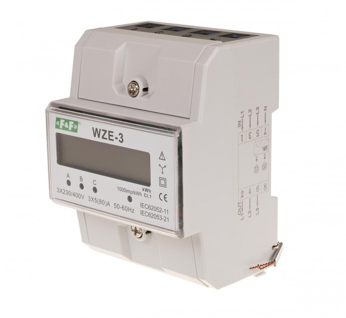 Specjalny układ elektroniczny pod wpływem przepływającego prądu i przyłożonego napięcia w każdej fazie generuje impulsy w ilości proporcjonalnej do pobieranej energii elektrycznej w tej fazie. Pobór energii w fazie sygnalizowany jest miganiem odpowiedniej LED (A, B, C). Suma impulsów z trzech faz sygnalizowana miganiem LED (1000 imp/kWh) przeliczana jest na energię pobraną w całym układzie trójfazowym, a jej wartość wskazywana jest przez segmentowy wyświetlacz LCD. Cyfra po przecinku oznacza części dziesiętne (0.1 KWh =100 Wh).