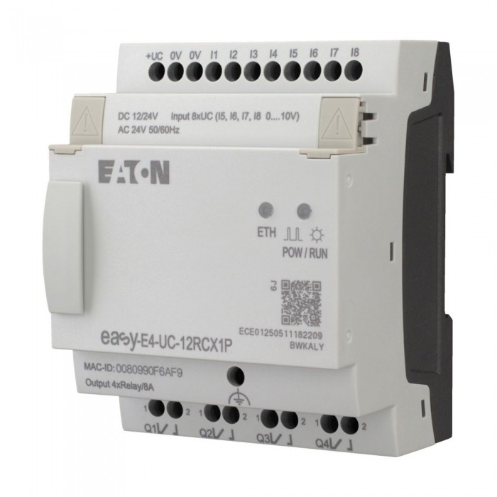 Przekaźniki programowalne, easyE4 (możliwość rozbudowy, Ethernet), 12/24 V DC, 24 V AC, Wejścia cyfrowe: 8, z czego jako analogowych można użyć: 4, za Elektroniczny przekaźnik programowalny o znamionowym napięciu roboczym 12 V DC, 24 V DC lub 24 V AC. 8 wejść cyfrowych 12 V DC, Dostępne 24 V DC lub 24 V AC, można również użyć 4 spośród tych wejść analogowych i 4 wejść jako szybkich liczników. Przekaźnik sterujący jest wyposażony w 4 wyjścia przekaźnikowe 12 – 250 V AC lub 12 – 240 V DC. Sterownik easy-E4 jest wyposażony w diagnostyczne diody LED, zegar, zintegrowany interfejs Ethernet i zaciski wtykowe. Przekaźnik sterujący można rozbudować za pomocą cyfrowych rozszerzeń we/wy serii easyE4.