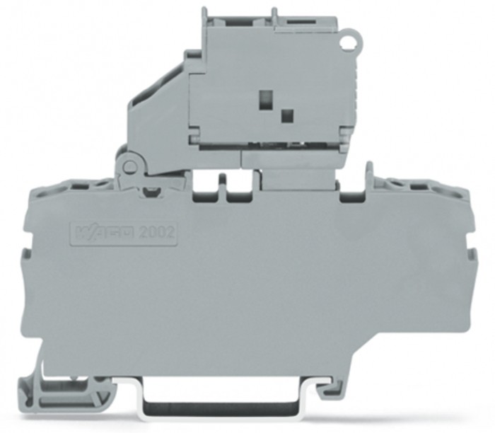 Złączka bezpiecznikowa 2-przewodowa; z uchylną podstawką bezpiecznika; z dodatkowym mostkowaniem; do wkładki bezpiecznikowej aparatowej 5 x 20 mm; bez sygnalizacji przepalenia wkładki; na szynę ts 35 x 15 i 35 x 7,5; 2,5 mm2; push-in cage clamp®; 2,50 mm2; szary