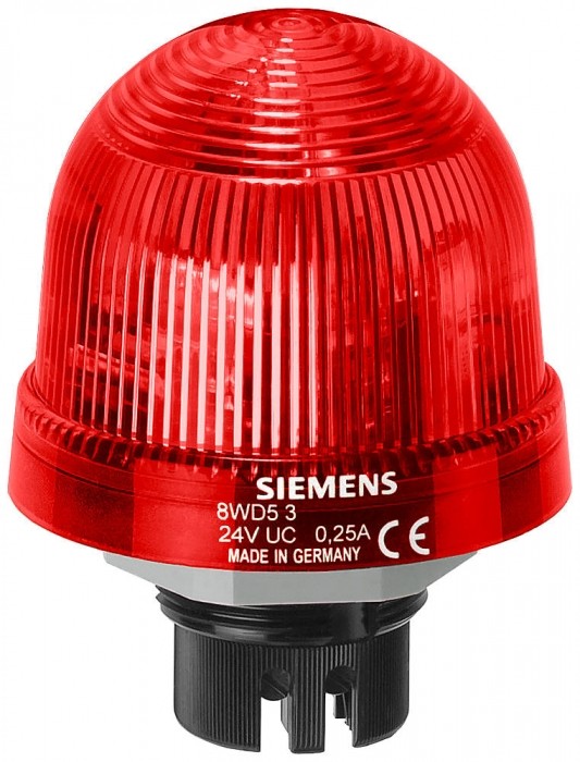 Oprawa wbudowana światło dookólne LED, 24V czerwone Oprawa wbudowana światło dookólne, z wbudowaną LED, czerwony, AC/DC 24 V, średnica 70 mm Obrotowy element świetlny SIRIUS 8WD53 z elementem świecącym do wizualnego sygnalizowania w przypadku trudnych warunków otoczenia oraz instalacji na terenie otwartym, np. do optycznej sygnalizacji stanu roboczego w instalacjach produkcyjnych. Oprawy wbudowane są wyjątkowo odporne na wstrząsy i wibracje. Ich specjalna konstrukcja umożliwia optymalne promieniowanie w kierunku bocznym lub w górę. Oprócz światła ciągłego dostępne są również lampy migowe, obrotowe lampy, jak również lampy błyskowe o różnych kolorach i napięciach. Jako akcesoria dostępne są stopki, rury, adaptery, żarówki, diody oraz adaptery do rur. Kolumny sygnalizacyjne SIRIUS 8WD - modułowe i zdolne do komunikacji.