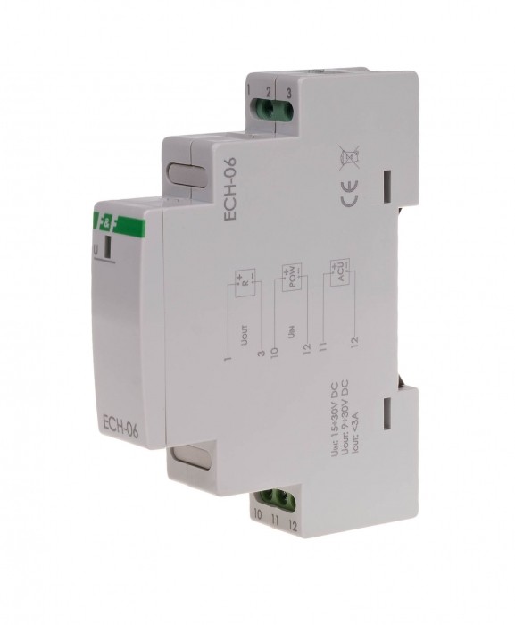 Moduł rezerwy zasilania z ładowarką akumulatora 1,3-7,2 Ah. Moduł ECH-06 wraz z zewnętrznym akumulatorem żelowym o napięciu nominalnym 12 V stanowi układ zasilania rezerwowego dla odbiorników o napięciu zasilania w zakresie 9÷30 V DC.