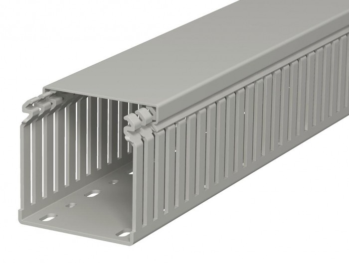Kanał grzebieniowy 75x75x2000 polichlorek winylu szary kamienny RAL 7030 Kanał grzebieniowy z pokrywą i perforacją podstawy wg normy DIN EN 50085-2-3. Wykonanie specjalne na zapytanie.