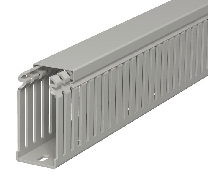 Kanał grzebieniowy 75x37,5x2000 polichlorek winylu szary kamienny RAL 7030 Kanał grzebieniowy z pokrywą i perforacją podstawy wg normy DIN EN 50085-2-3. Wykonanie specjalne na zapytanie.
