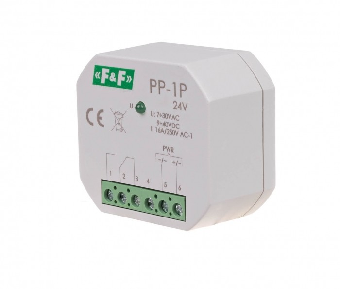 Konfiguracja styków 1 x styk przełączny (NO/NC). Prąd obciążenia 16 A. Napięcie zasilania 7÷30 V AC / 9÷40 V DC. Przekaźnik elektromagnetyczny w obudowie do bezpośredniego montażu w puszce podtynkowej O60.