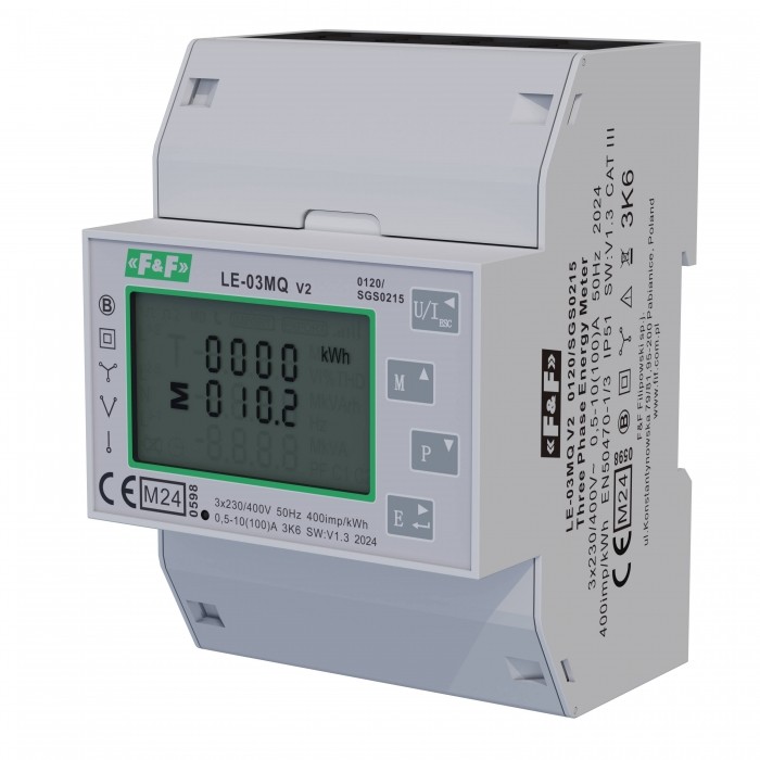 Trójfazowy, bezpośredni, dwukierunkowy, czterokwadrantowy pomiar energii elektrycznej i parametrów sieci, zgodny z dyrektywą MID, interfejs RS-485 i protokół komunikacyjny Modbus RTU. LE-03MQ jest statycznym (elektronicznym) wzorcowanym licznikiem energii elektrycznej prądu przemiennego jednofazowego lub trójfazowego w układzie bezpośrednim. Służy do wskazań i rejestracji pobranej energii elektrycznej oraz parametrów sieci zasilającej z możliwością zdalnego odczytu wskazań poprzez przewodową sieć standardu Modbus RTU. Konfiguracja licznika odbywa się poprzez menu konfiguracyjne dostępnego z panelu czołowego oraz poprzez port komunikacyjny zgodnie z funkcjami programowymi Modbus RTU.