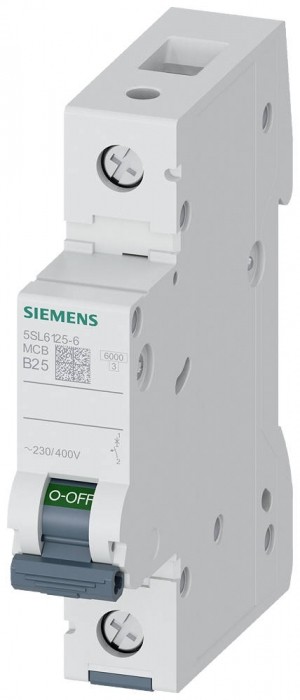 Wyłącznik nadprądowy 230/400V 6kA, 1-bieg., B, 25A wyłącznik nadmiarowo-prądowy 230/400 V 6 kA, 1-bieg., B, 25 A Wyłącznik nadmiarowo-prądowy SENTRON do bezpiecznej ochrony przeciwzwarciowej i przeciążeniowej w standardowych zastosowaniach w budynkach mieszkalnych i użytkowych. Montaż i demontaż urządzenia bez użycia narzędzi. Proste okablowanie zasilania przez położoną z tyłu szynę zbiorczą. Wyłączniki nadmiarowo-prądowe 5SL są dostępne w wersjach 1-, 2-, 3-, 4-, a także w wersjach 1+N- i 3+N-biegunowych oraz w innych wykonaniach specjalnych. Szeroka gama akcesoriów, np. łącznik pomocniczy, umożliwia różnorodne rozszerzenie funkcji. Po prostu bezpiecznie z urządzeniami ochronnymi SENTRON.