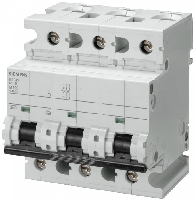 Wyłącznik nadprądowy 400V 10kA, 3-bieg., B, 100A, głęb.=70mm wyłącznik nadmiarowo-prądowy 400 V 10 kA, 3-bieg., B, 100 A, głęb.=70 mm Wyłącznik nadmiarowo-prądowy SENTRON 5SP4 do skutecznej ochrony osób i instalacji przez bezpieczne odłączenie w przypadku przeciążenia lub zwarcia. Wyłączniki nadmiarowo-prądowe są proste w montażu i oferują niezawodne bezpieczeństwo podczas instalacji dzięki standardowo stosowanej ochronie przed chwyceniem i dotykiem. Ponadto są wyposażone w dobrze widoczny wskaźnik położenia przełączania. Kod Datamatrix z przodu urządzenia pozwala szybko i wygodnie uzyskać wszystkie informacje dotyczące wyłącznika nadmiarowo-prądowego. Jednolite, a jednocześnie niezwykle różnorodne wyposażenie dodatkowe charakteryzujące się łatwym montażem i wymiennością elementów. Po prostu bezpiecznie z urządzeniami ochronnymi SENTRON.