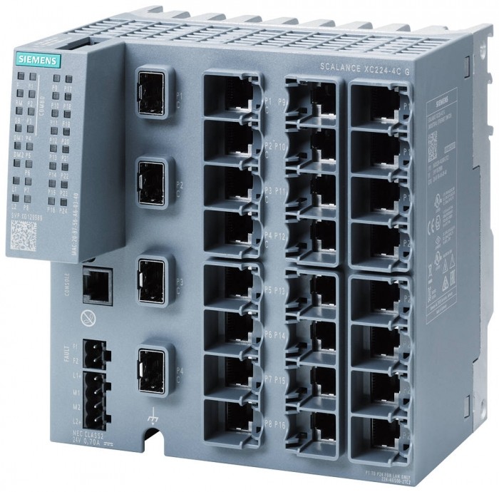 SCALANCE XC224-4C G, zarz. przeł. Layer 2, 20 x RJ45, 4 x port Combo (SFP/RJ45) SCALANCE XC224-4C G zarządzalny przełącznik Layer 2 IE; certyfikowany IEC 62443-4-2; Full Gigabit; 20 × 10/100/1000 Mbit/s porty RJ45; 4 × 1000 Mbit/s porty combo (do wykorzystania porty albo 1000 Mbit/ s SFPs lub 10/100/1000 Mbit/s zastosowanie portów RJ45); 1 × port konsoli; diagnostyka LED; redundantny zasilacz napięciowy; zakres temp. -40°C do +70°C; montaż: szyna montażowa/S7/profilowa / ściana; funkcje redundancji; funkcje Office (RSTP, VLAN,...); PROFINET IO Device; zgodność z Ethernet/IP; slot C-PLUG; IEEE 1588v2 PTP SCALANCE XC224-4C G, switch zarządzalny warstwy 2, 20x RJ45, 4x port Combo (SFP/RJ45). Odpowiedni do wielu zadań: SCALANCE X224-4C oferuje szeroką gamę wysokowydajnych switchy Ethernet w różnych wariantach, od switchy gigabitowych po wytrzymałe switche spełniające wymagania automatyki procesowej i dyskretnej. Wydajne switche gigabitowe SCALANCE X224-4C zostały opracowane do wymagających sieci w środowiskach przemysłowych. Dzięki wydajnemu sprzętowi i zaawansowanym funkcjom użytkownik zyskuje niezawodną i skalowalną infrastrukturę sieciową do dowolnych zastosowań. Proste i niezawodne rozwiązanie do wielu zastosowań przemysłowych.