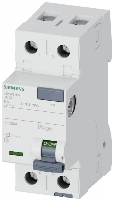 Wyłącznik różnicowoprądowy 1+N typ AC, In: 16 A, 30 mA, Un AC: 230 V wyłącznik ochronny różnicowy, 2-bieg., typ AC, In: 16 A, 30 mA, Un AC: 230 V zastosowanie tych urządzeń nie jest dopuszczalne we wszystkich krajach. przestrzeganie krajowych przepisów instalacyjnych! Wyłącznik ochronny różnicowy SENTRON 5SV4 do kompleksowej ochrony ludzi i mienia przed porażeniem prądem elektrycznym. Wyłączniki ochronne różnicowe zapewniają niezawodne bezpieczeństwo podczas instalacji dzięki standardowo stosowanej ochronie przed chwytaniem i dotykiem. Dzięki wygodnej ręcznej obsłudze suwakowej możliwe jest beznarzędziowe zdejmowanie wyłącznika ochronnego różnicowego z szyny montażowej lub układu szyn zbiorczych. Przez kod Datamatrx na urządzeniu zapewniony jest szybki dostęp do wszystkich danych technicznych w aplikacji Siemens Industry Online Support. Urządzenia zabezpieczające SENTRON można rozbudować o wiele funkcji za pomocą uniwersalnych akcesoriów z systemu modułowego. Optymalna technika gwarantująca bezpieczeństwo - tylko od firmy Siemens.