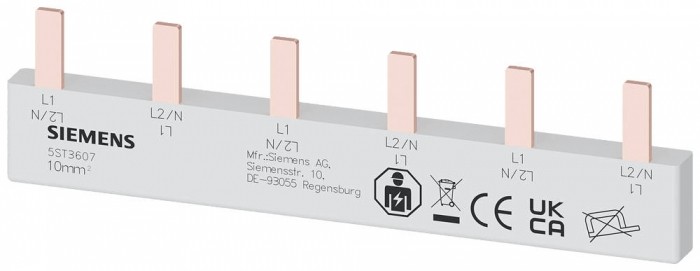 Szyna łączeniowa grzebieniowa 10 mm2, 2-faz., 3x (1-faz.+N), 102 mm szyna zbiorcza kołkowa, 10 mm2 przyłącze: 3x 2-faz. zabezpieczona przed dotknięciem szyna zbiorcza kołkowa SENTRON 5ST3 jako komponenty dodatkowe do urządzeń różnicowoprądowych i wyłączników nadmiarowo-prądowych. Te dodatkowe komponenty można uniwersalnie instalować. Są łatwe i wygodne w montażu i łączeniu. Dzięki standardowej ochronie przed dotykiem zapewnione jest bezpieczeństwo podczas instalacji. Optymalna technika gwarantująca bezpieczeństwo - tylko od firmy Siemens.