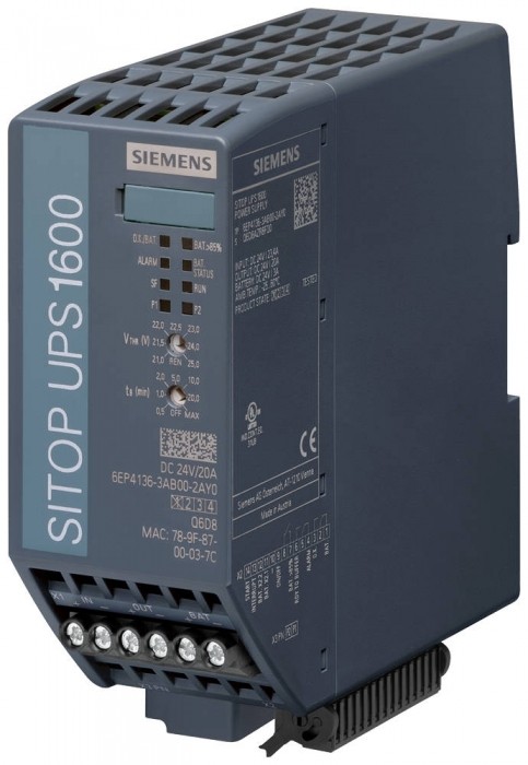 Zasilacz bezprzerwowy SITOP UPS1600, DC 24 V/20 A z IE/PN SITOP UPS1600 20 A Ethernet/ PROFINET bezprzerwowe zasilanie elektryczne z Ethernet / interfejs PROFINET / OPC UA serwer / webserwer wejście: 24 V DC wyjście: 24 V DC/20 A SITOP UPS1600 z modułami bateryjnymi UPS1100 jest optymalnym uzupełnieniem wszystkich zasilaczy 24 V. Buforuje dłuższe awarie sieci zasilającej przez czas sięgający godzin i zapewnia nieprzerwaną pracę instalacji. Inteligentny system zarządzania baterią automatycznie rozpoznaje system magazynowania energii UPS1100 oraz zapewnia optymalne ładowanie z kontrolą temperatury i ciągłe monitorowanie. Kompaktowe moduły UPS1600 oferują nowe możliwości w zakresie diagnostyki i integracji systemów. Dzięki dwóm portomEthernet/PROFINET można je łatwo integrować z komputerami PC lub sterownikami PLC. Pełna integracja z TIA oferuje wygodne projektowanie w TIA Portal i jest ułatwiona dzięki gotowym blokom funkcyjnym do tworzenia obiektów typu faceplate w S7 i WinCC, co przyspiesza wizualizację. Zintegrowany serwer WWW i SITOP UPS Manager umożliwiają również proste monitorowanie i konfigurację w systemach komputerowych, np. zamykanie kilku komputerów na zasadzie master-slave.