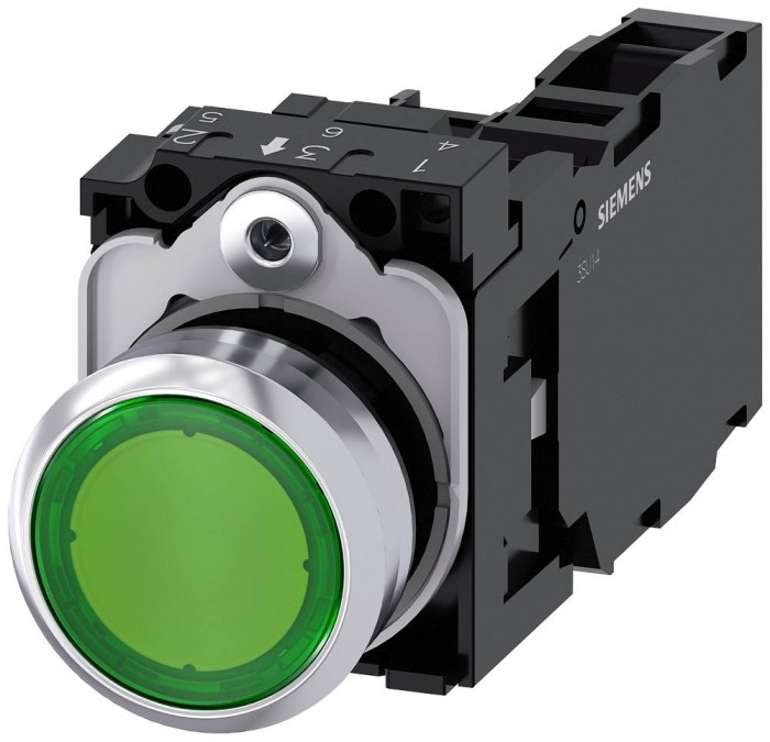 Przycisk z lampką kontrolną, 22 mm, okrągły, metal, błyszczący, zielony, Przycisk, płaski, impulsowy, z uchwytem, 1NO+1NC, Moduł LED ze zintegrowaną diodą LED AC/DC 24V, przyłącze śrubowe Przycisk z lampką kontrolną SIRIUS ACT do przełączania i sterowania odbiornikami elektrycznymi. SIRIUS ACT to jedyna w swoim rodzaju oferta urządzeń sterowniczych oraz sygnalizacyjnych mających dopuszczenia produktowe na całym świecie, dostępna w trzech nowoczesnych liniach wzorniczych wykonanych z wytrzymałego metalu oraz wysokogatunkowego tworzywa sztucznego.Innowacyjna koncepcja łączenia ułatwia montaż, dzięki czemu można go wykonać jedną ręką bez użycia żadnych specjalnych narzędzi. Do montażu wystarczają też otwory bez rowków, ponieważ 100-procentowe zabezpieczenie przed przekręceniem jest już zintegrowane w produkcie.Dzięki stałemu wysokiemu stopniowi ochrony te wytrzymałe urządzenia nadają się do użycia w przemyśle oraz na zewnątrz pomieszczeń zamkniętych. Urządzenia można czyścić myjkami wysokociśnieniowymi. Ani kurz, ani oleje, ani agresywne zasady nie są w sanie zakłócić eksploatacji.Oprócz zastosowania standardowego okablowania urządzenia można podłączać do sterownika także przez PROFINET, AS-Interface lub IO-Link. Tym samym można zredukować nakłady na okablowanie, zminimalizować źródła błędów oraz uzyskać większą elastyczność.Graficzny konfigurator online stanowi wygodne wsparcie na etapie dokonywania wyboru oraz składania zamówienia pojedynczych urządzeń, obudów oraz opisów. Dostępna jest także obszerna dokumentacja (np. podręcznik, dane 3D, schemat połączeń). Dostępne wersje: wiele kolorów, podświetlane/niepodświetlane, z/bez napisu, uruchamianie bez samopowrotu/impulsowe, różne wysokościprzycisków i pierścieni przednich. Uwaga: Kompletne urządzenie, Dostawa wraz z uchwytem i modułami. SIRIUS ACT - moc w działaniu podczas sterowania i sygnalizacji. Łatwy montaż, po prostu mocny, po prostu perfekcyjny.