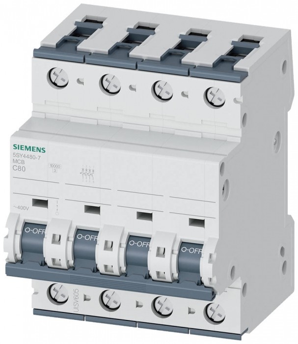 Wyłącznik nadprądowy 400V 10kA, 4-bieg., C, 80A, głęb.=70mm wyłącznik nadmiarowo-prądowy 400 V 10 kA, 4-bieg., C, 80 A, głęb.=70 mm Wyłącznik nadmiarowo-prądowy SENTRON do bezpiecznej ochrony przeciwzwarciowej i przeciążeniowej w budynkach mieszkalnych, użytkowych i specjalnych zastosowaniach przemysłowych. Montaż i demontaż urządzenia bez użycia narzędzi, za pomocą podwójnego suwaka. Dowolna kombinacja przewodów i szyny zbiorczej dzięki dwukomorowemu zaciskowi. Proste okablowanie zasilania przez położoną z tyłu szynę zbiorczą. Wyłączniki nadmiarowo-prądowe 5SY są dostępne w wersjach 1-, 2-, 3-, 4-, a także w wersjach 1+N- i 3+N-biegunowych. Kompleksowe akcesoria są takie same dla wszystkich wyłączników nadmiarowo-prądowych 5SY. Po prostu bezpiecznie z urządzeniami ochronnymi SENTRON.