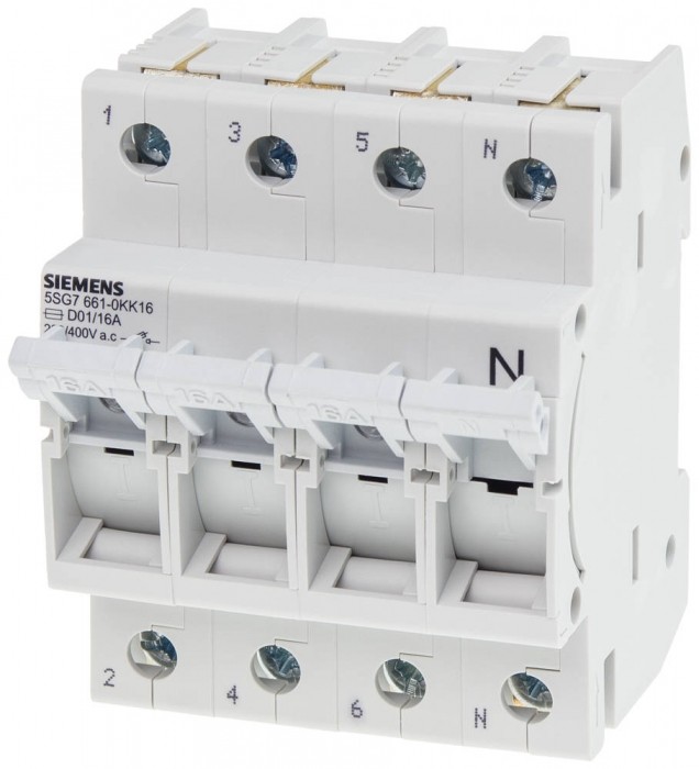 MINIZED, rozłącznik izolacyjny bezpiecznikowy, D01, 4-bieg., 3P+N, In: 16 A, Un AC: 400 V MINIZED, rozłącznik izolacyjny bezpiecznikowy, D01, 4-bieg., 3-bieg. + N, In: 16 A, Un AC: 400 V bez wkładki topikowej SENTRON 5SG7 .