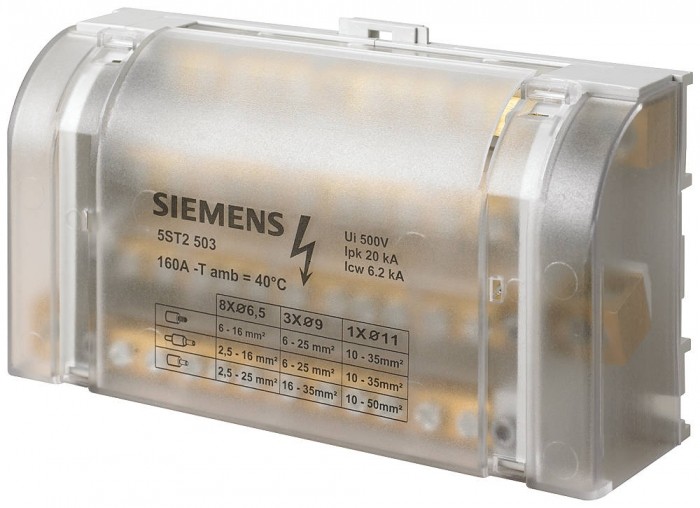 blok rozdzielczy 4-bieg., 160 A, 500 V wejście: 1x 10-35 mm2 wyjście: 3x 6-25+8x 2,5-16 mm2 do montażu na szynie montażowej blok rozdzielczy 4-bieg., 160 A, 690 V, wejście: 1 x 10-50 mm2, wyjście: 3 x 10-35 mm2 + 8 x 2,5-16 mm2 do montażu na szynie montażowej Blok rozdzielczy SENTRON 5ST2 jako komponenty dodatkowe do urządzeń różnicowoprądowych i wyłączników nadmiarowo-prądowych. Te dodatkowe komponenty można uniwersalnie instalować. Są łatwe i wygodne w montażu i łączeniu. Dzięki standardowej ochronie przed dotykiem zapewnione jest bezpieczeństwo podczas instalacji.