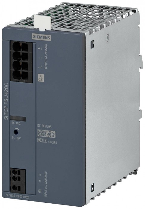 Zasilacz SITOP PSU4200, 1-faz. DC 24 V/20 A SITOP PSU4200 1AC 24 V/20 A regulowane zasilanie elektryczne PSU4200 wejście: 120/240 V AC wyjście: 24 V DC/20 A Zasilacze elektryczne jednofazowe SITOP PSU4200 są przystosowane do realizacji podstawowych wymagań w środowiskach przemysłowych i oferują wszystkie ważne funkcje w korzystnej cenie. Wejście z automatycznym przełączaniem zakresu napięcia umożliwia podłączenie urządzenia do różnego rodzaju jednofazowych sieci zasilających. Dzięki wąskiej konstrukcji zasilacze sieciowe zajmują niewiele miejsca na szynie montażowej, a ich wysoka sprawność minimalizuje ilość ciepła emitowanego do szafy sterowniczej. Dla dalszego zwiększenia dostępności zasilania 24 V, zasilacze sieciowe SITOP PSU4200 można łączyć z modułami buforującymi, redundancji i selektywności. Niezależnie od branży, niezależnie od wymagań - Siemens oferuje niezawodne i wydajne zasilacze elektryczne do każdej instalacji.