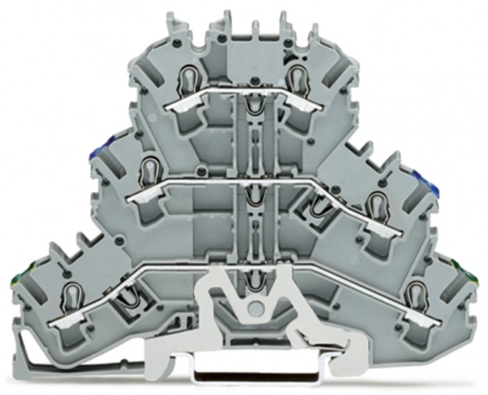 Złączka 3-piętrowa; złączka pe/przelotowa/przelotowa; 2,5 mm2; pe/n/l; do zastosowań ex e ii; bez podstawki oznacznika; na szynę ts 35 x 15 i 35 x 7,5; push-in cage clamp®; 2,50 mm2; szary