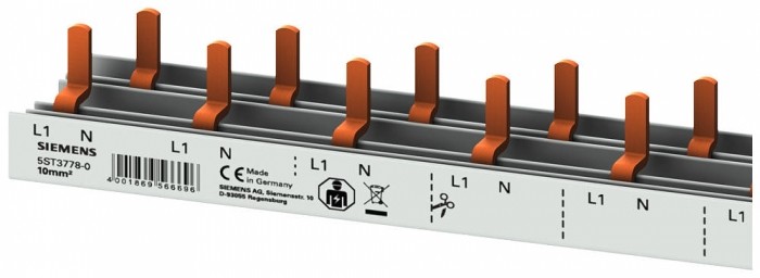 Szyna łączeniowa grzebieniowa 10 mm2, 2-faz., 40x (1-faz.+N+AUX), 1055 mm, z możliwością cięcia szyna kołkowa kompaktowa, 10 mm2 przyłącze 1-faz./N urządzenie kompaktowe 1 DU + łącznik pomocniczy 0,5 DU zabezpieczona przed dotknięciem 1 m z możliwością cięcia szyna zbiorcza kołkowa SENTRON 5ST3 jako komponenty dodatkowe do urządzeń różnicowoprądowych i wyłączników nadmiarowo-prądowych. Te dodatkowe komponenty można uniwersalnie instalować. Są łatwe i wygodne w montażu i łączeniu. Dzięki standardowej ochronie przed dotykiem zapewnione jest bezpieczeństwo podczas instalacji. Optymalna technika gwarantująca bezpieczeństwo - tylko od firmy Siemens.